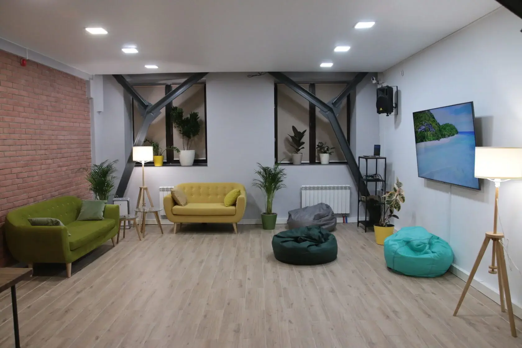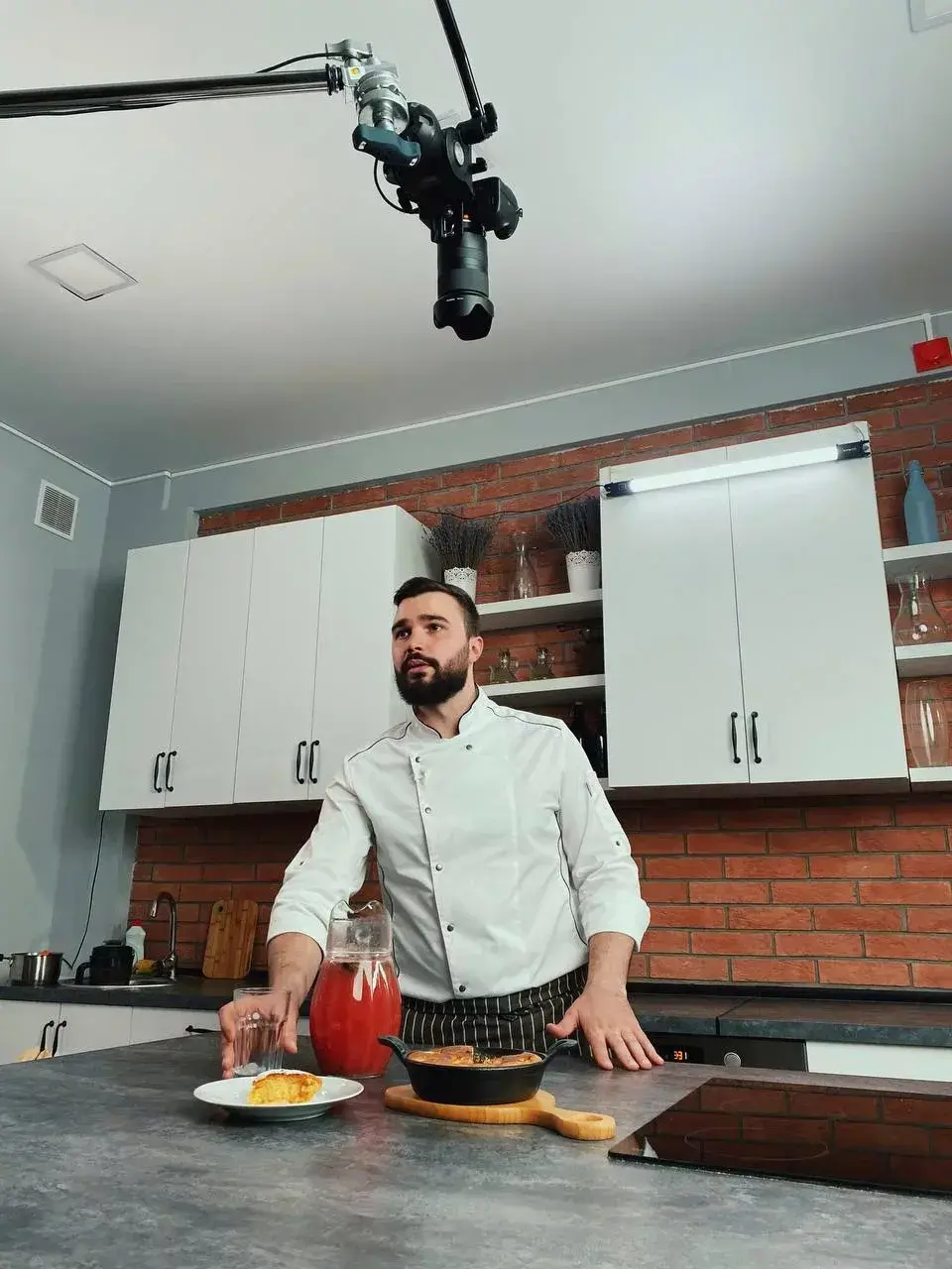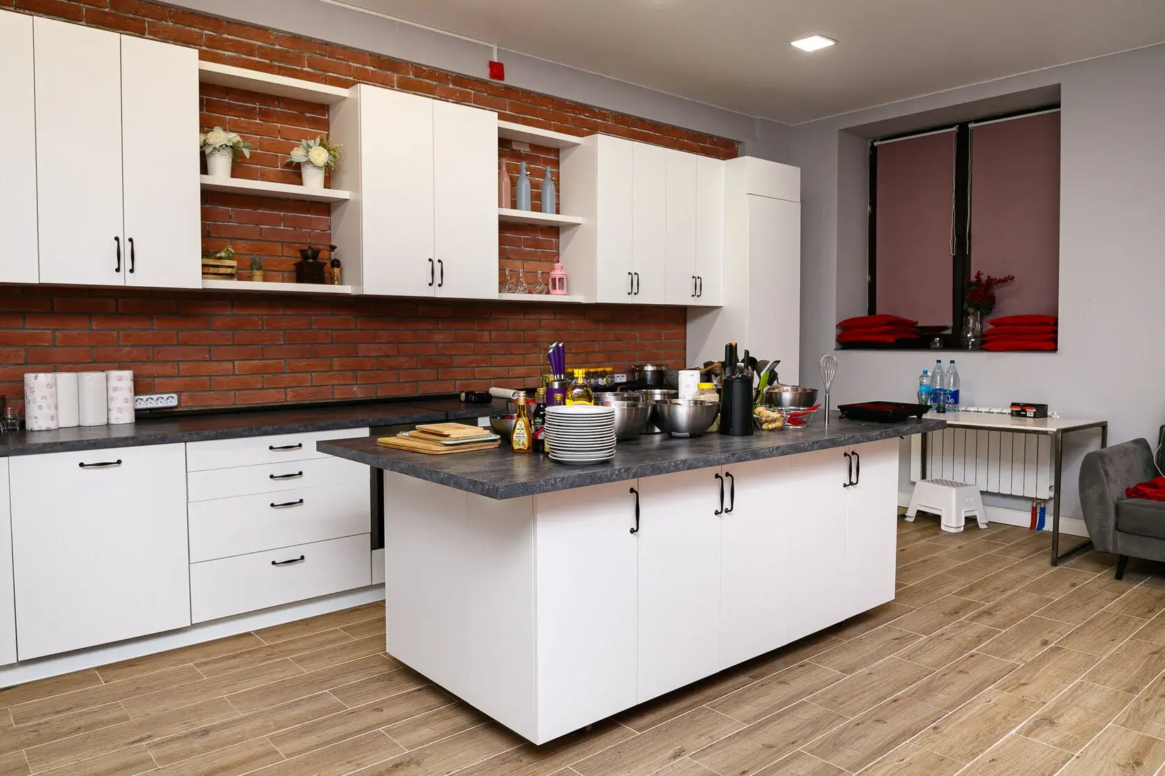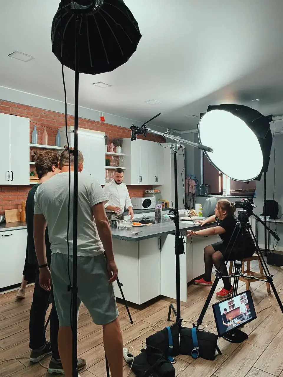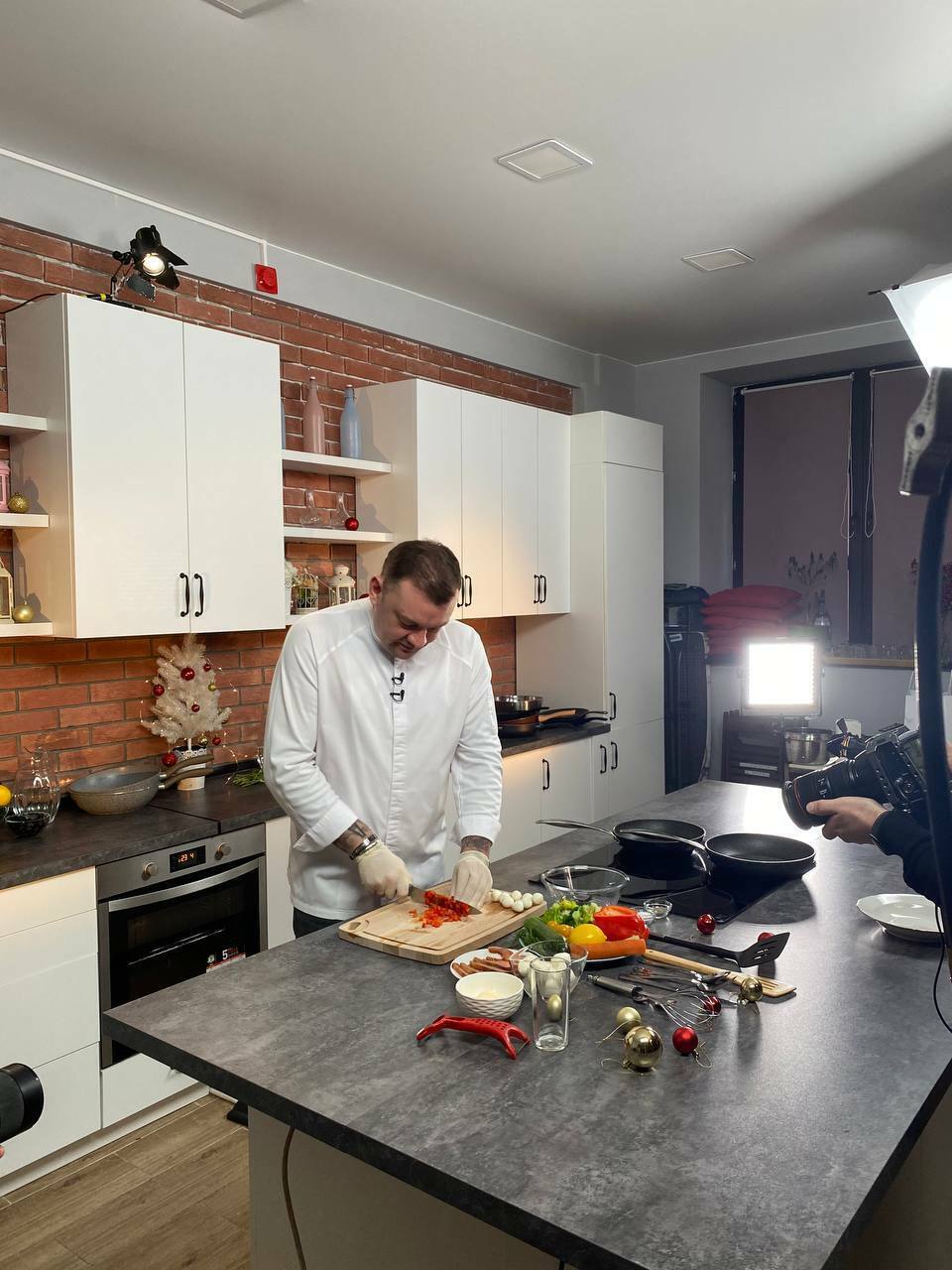 Разные варианты фона: красный кирпич, белый кирпич, кухня. Гримерное место, место звукорежиссера, декор. Свет, выделенный интернет, проектор и большие экраны для презентаций. Место для фото и обзора товаров, особенно если нужно отснять еду или кухонные предметы.